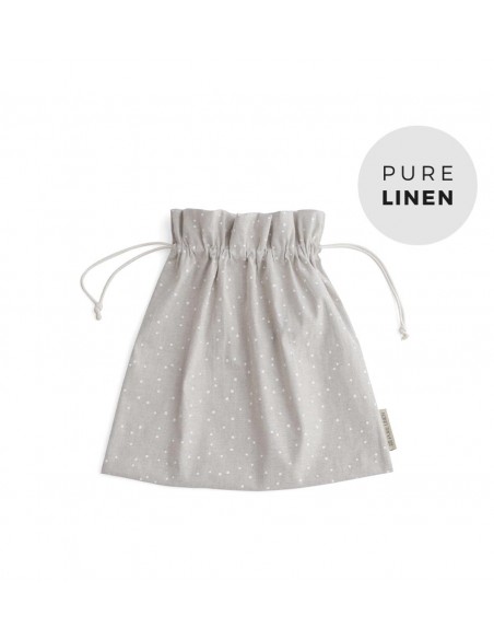 A drawstring bread bag crafted from cotton-linen mix, featuring a minimalist polka dot design. The breathable fabric helps maintain bread freshness by reducing moisture buildup while allowing airflow. The drawstring closure provides secure and easy access, making it a practical and eco-friendly alternative to disposable packaging. Ideal for storing homemade or artisan bread in style.