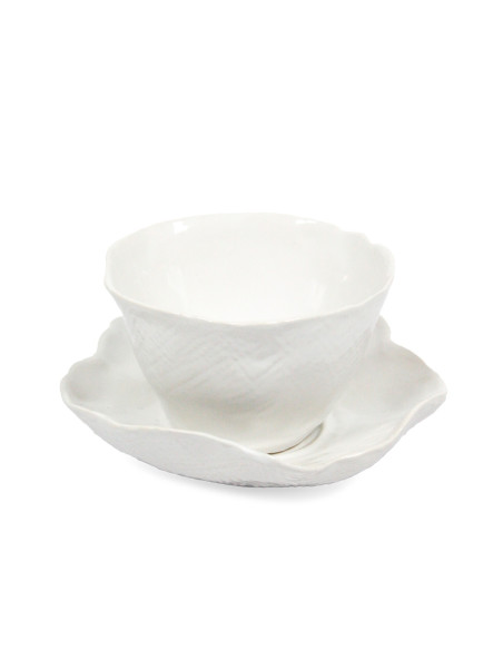 The Clair cup with saucer by Olsson & Jensen is crafted from ceramic and features a distinctive, handmade look inspired by the beauty of an oyster shell. Perfect for adding a touch of creativity and charm to any table setting.